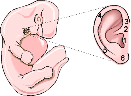 人类胚胎早期的形态有些类似于鱼类,头的两侧有两个腮裂。耳廓是由第一鳃弓尾缘和第二鳃弓头缘的六个间质细胞增殖小丘融合而来。